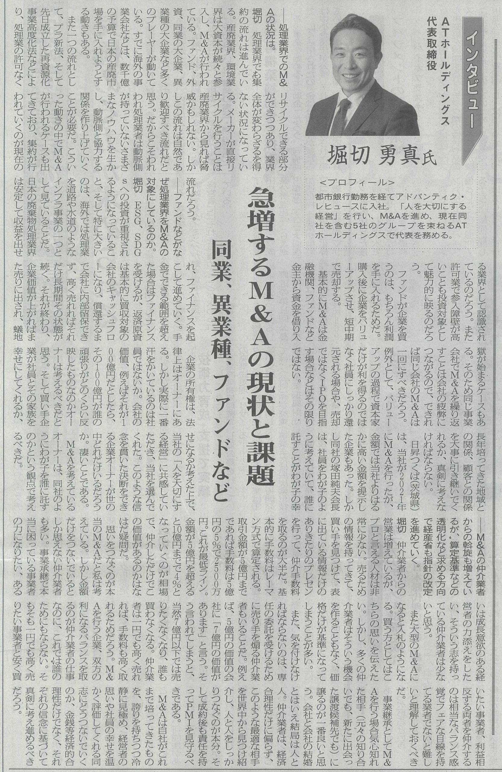7月29日付循環経済新聞に弊社代表堀切のインタビュー記事が掲載されました。